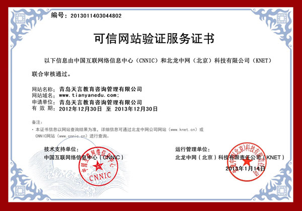 您现在的位置:韩语培训 > 资讯中心 > 天言资讯 > > 天言官网获得可信网站证书