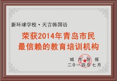 青岛城市信报联合青岛市教育局,开展了以“诚信教育”为主题,针对广大市民关心的教育培训机构、出国留学服务中介、教育消费品、职业学校等教育机构,根据信报记者的全面调查和青岛市民推荐和投诉情况。最终评出:“3·15”家长最信赖的教育培训机构 、3·15”市民最青睐的留学服务机构、“3·15”市民最关注的职业学校、“3·15”市民最放心早教机构等奖项,其中天言韩国语在此次活动中,获得3.15家长最信赖的教育机构奖项,非常感谢广大媒体的监督和给予的肯定,也非常感谢广大支持天言韩国语的学生和家长,我们以后一定将天言韩国语这个品牌打造成为行业诚信的第一品牌。