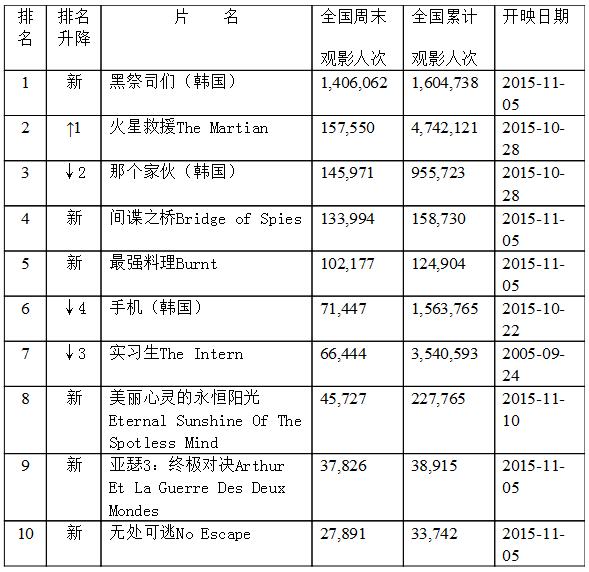 上周有六部新片打榜成功,除了《黑祭司们》外,其它几部票房表现都差强人意。史蒂文·斯皮尔伯格执导的冲奥力作《间谍之桥》和美国喜剧片《最强料理》,分别以133,994和102,177的观影人次,位列榜单第四、第五位。其它三部11月5日开画的新片,好莱坞喜剧明星金?凯瑞主演的奇幻爱情片《美丽心灵的永恒阳光》、法国大导演吕克·贝松执导的冒险奇幻作品《亚瑟3:终极对决》、韦恩斯坦出品的动作惊悚片《无处可逃》则集体哑火,周末观影人次依次是45,727、37,826和27,891,排名则是第八位到第十位。