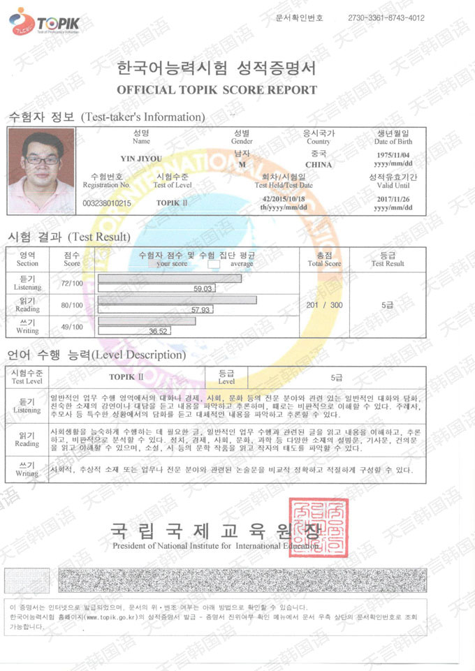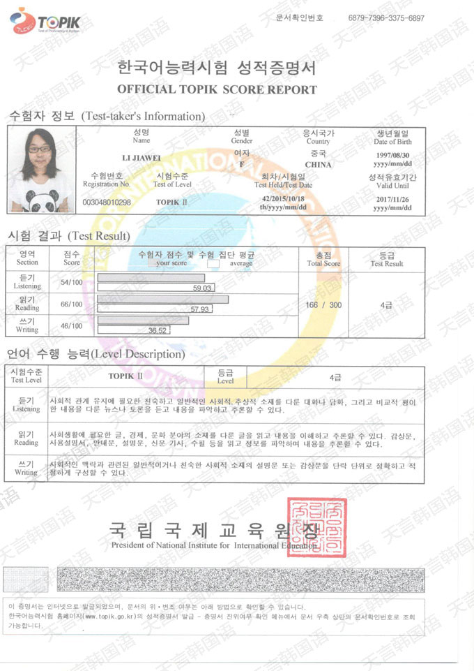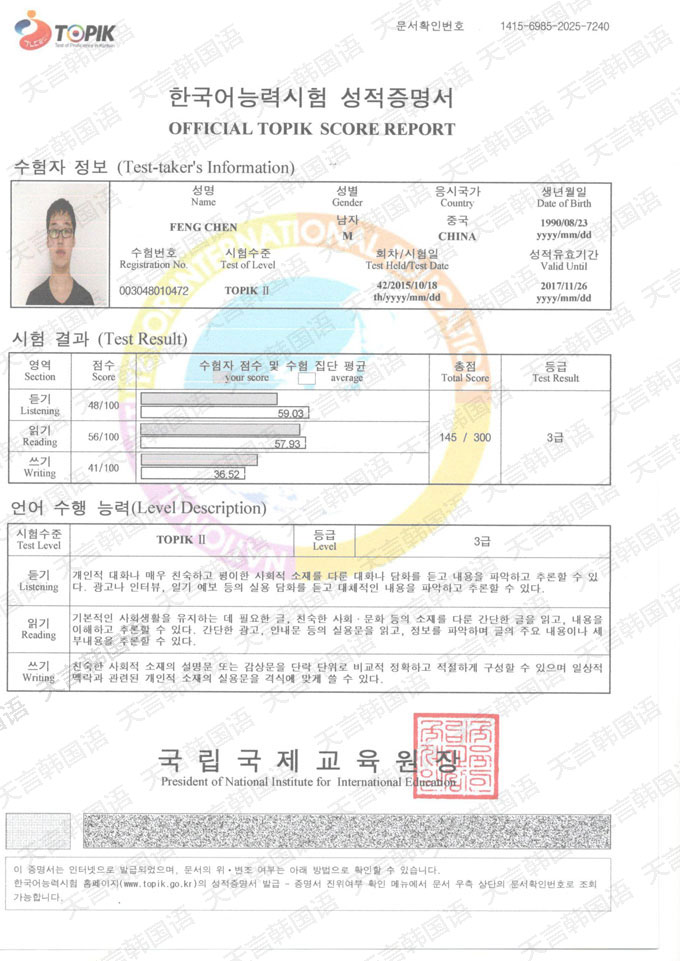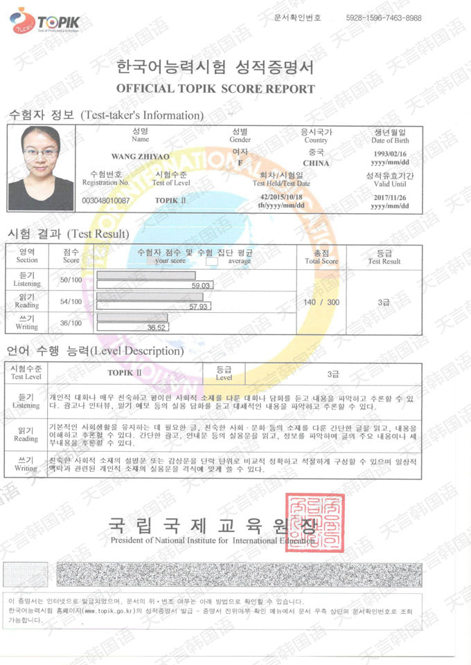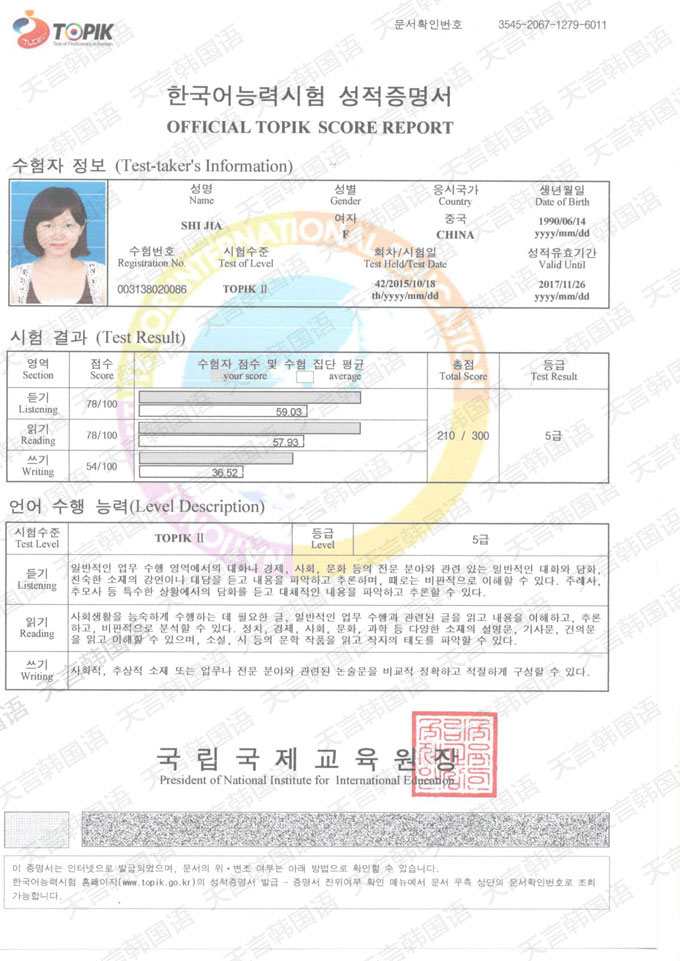 在2015年10月第42届韩语TOPIK等级考试中,天言韩语的学员们都获得了优异的成绩,都圆满地达成了自己的目标。没有昨天的辛勤耕耘,就没有今天的硕果,今天的成绩是昨天付出的回报。