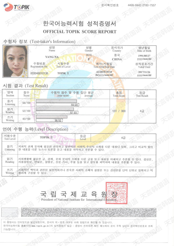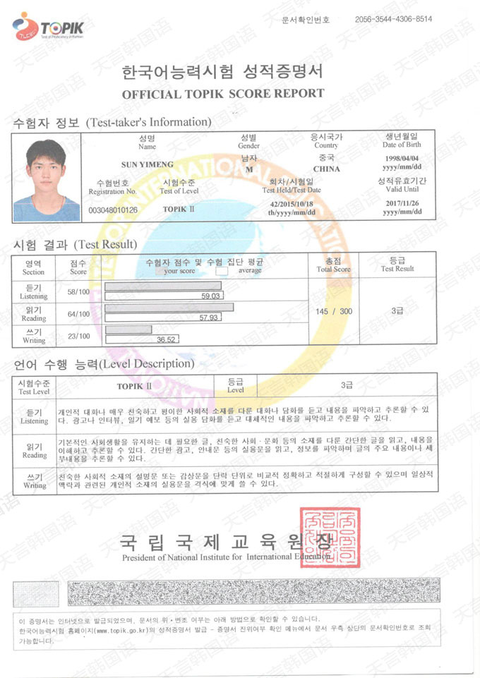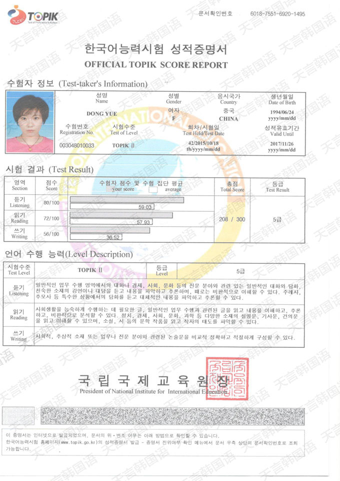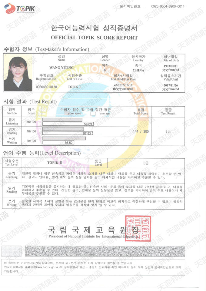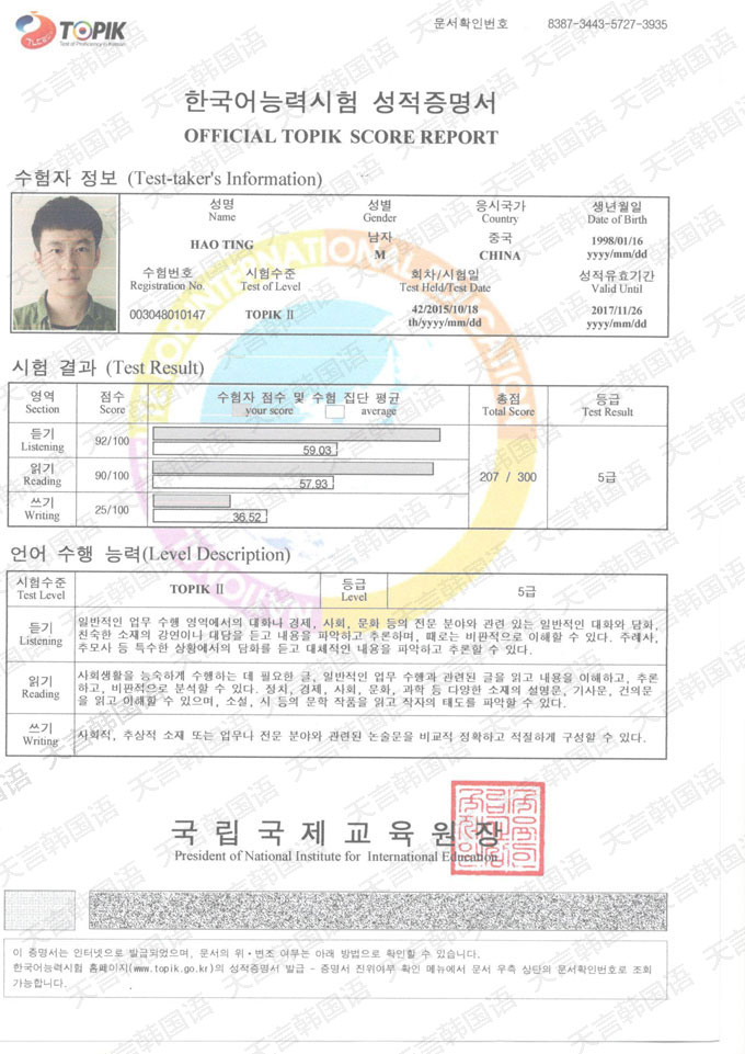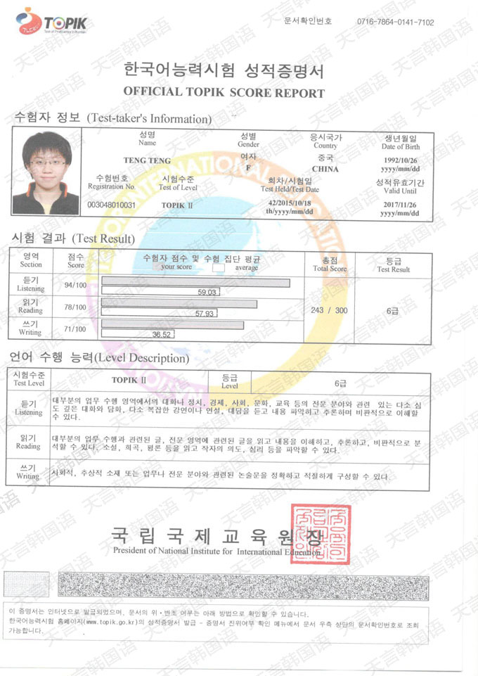 在2015年10月第42届韩语TOPIK等级考试中,天言韩语的学员们都获得了优异的成绩,都圆满地达成了自己的目标。没有昨天的辛勤耕耘,就没有今天的硕果,今天的成绩是昨天付出的回报。