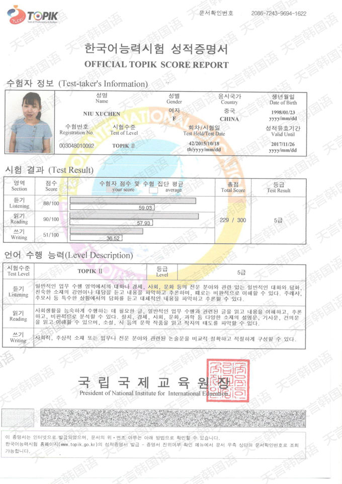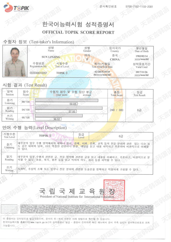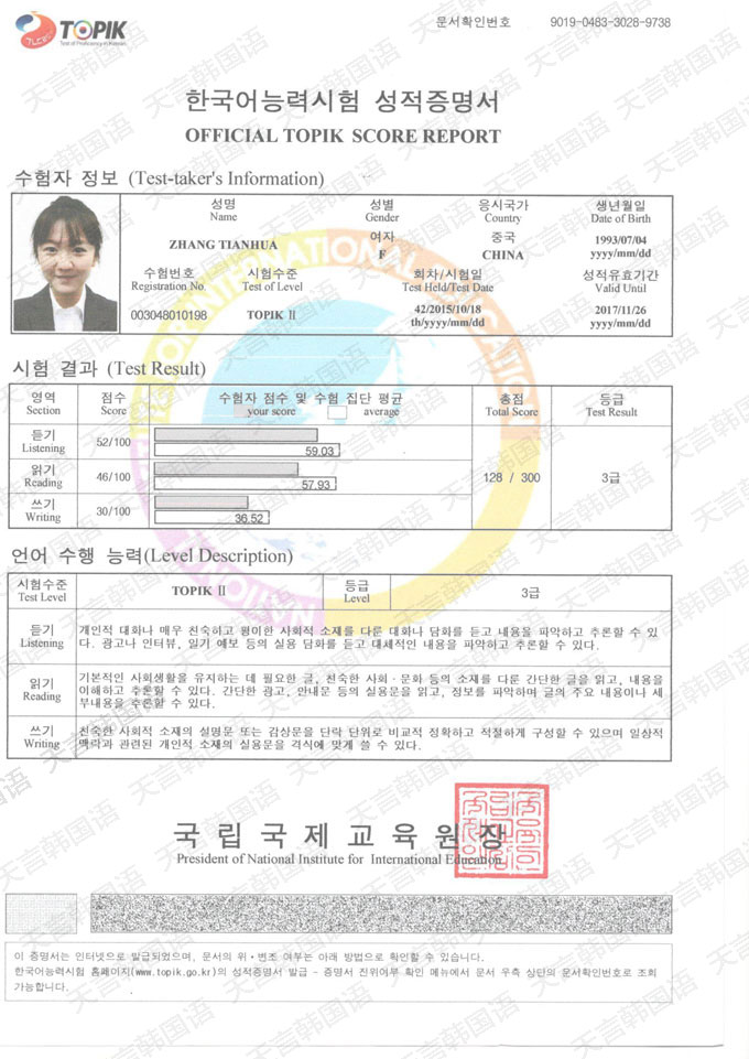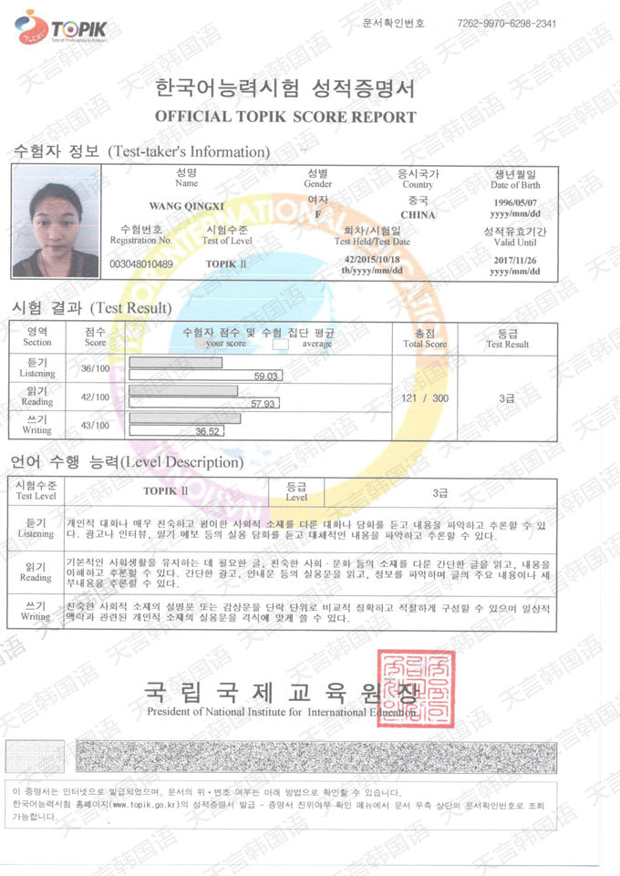 第42届TOPIK(国际韩国语言认证考试),天言韩语学员参加者19人,通过者19人,通过率100%,再次印证了天言韩语岛城顶级韩语培训的实力!