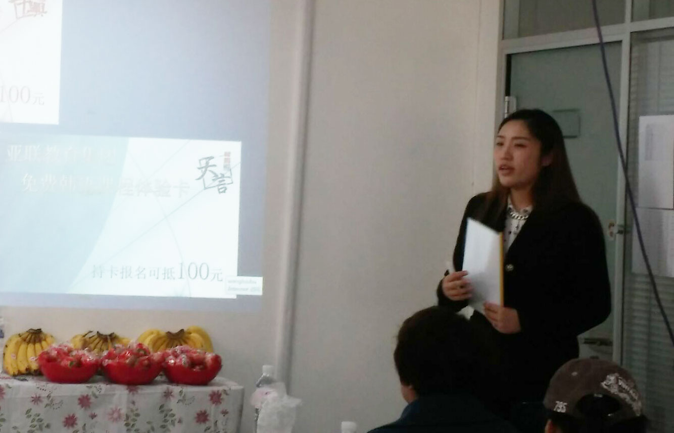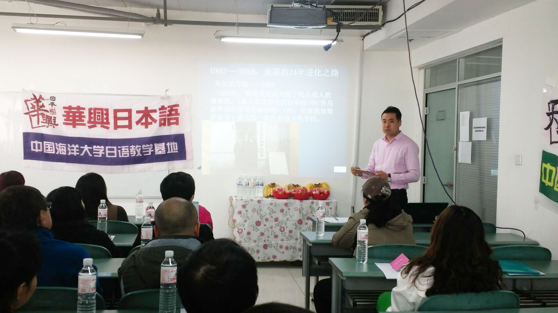 首先,朱校长给我们介绍了学校的发展史:1992年,青岛市正式开始了民办成人教育审批,<私立青岛华兴日语学校>和<青岛新环球外国语专修学校>(注:亚联教育集团前身)成为第一批民办语言类学校;2005年初,我们搬进了新教室,宽敞明亮,不在是粉笔末满屋飞;2005年末,亚联成为青岛极少数可以合法聘请外国文教专家和外籍工作人员的民办培训机构;2012年,亚联教育集团进入升级蜕变, 进行了软硬件全面升级,三大旗下品牌,华兴日本语、天言韩国语、新环球汉语全面发展;如今,亚联教育的羽翼更加丰满,我们将不忘初心,向着更远的未来进发!
