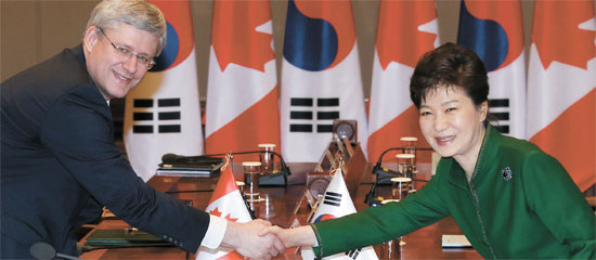 朴槿惠总统与加拿大总理哈珀3月11日发布称,韩加自由贸易协定(FTA)的谈判已经成功达成妥协。此时距离谈判开始整整过了8年零8个月时间。两位首脑举行单独与扩大首脑会谈后发表共同声明,表示“韩加FTA谈判成功实现妥协,是两国共同取得的跨时代成果”,“韩加关系将进一步得到强化”。